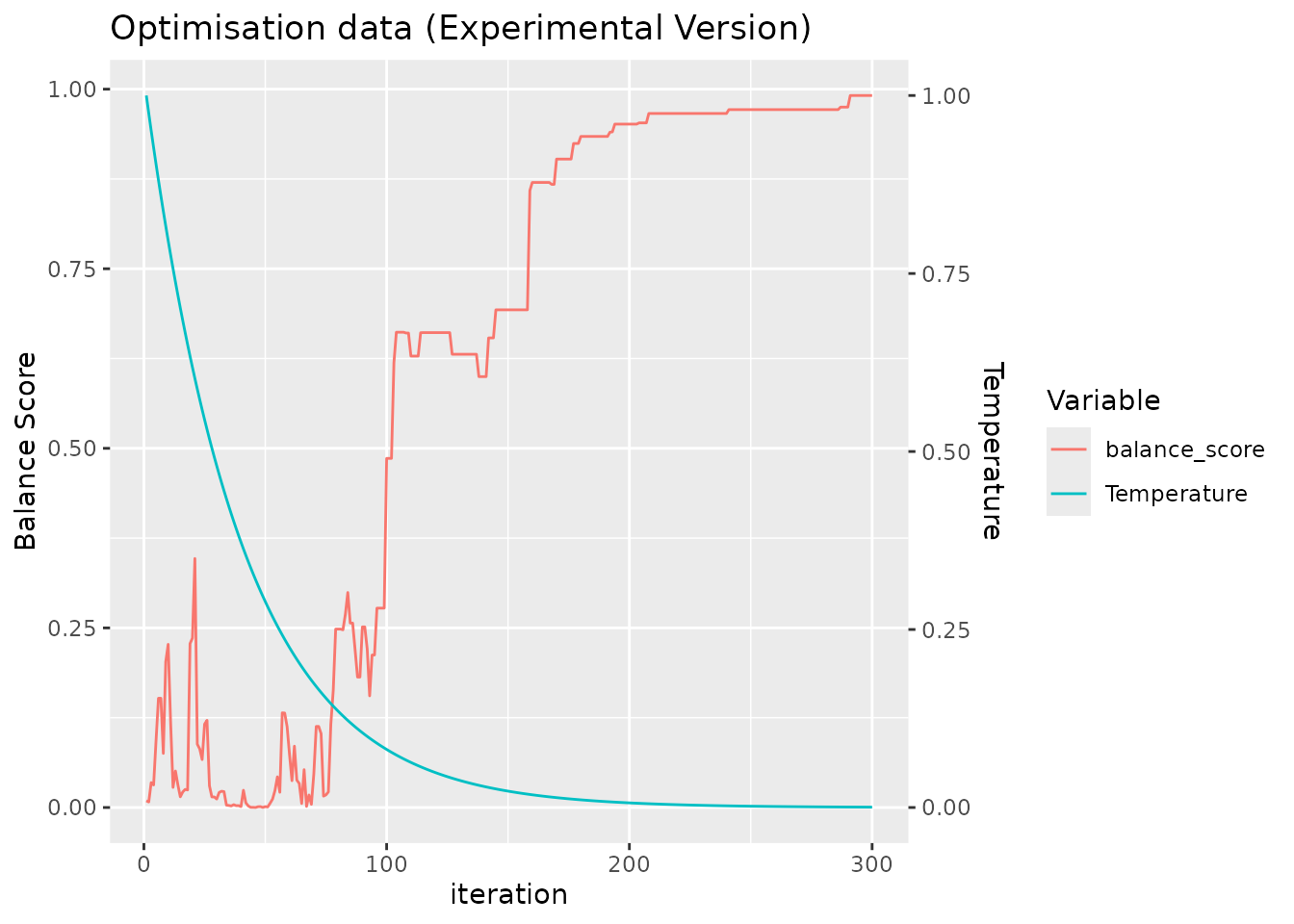 For clarity, we return a plot to make it easy for the user to confirm that the simulated annealing algorithm has been run with a sufficient number of iterations to converge, seen by the saturation of the balance score.